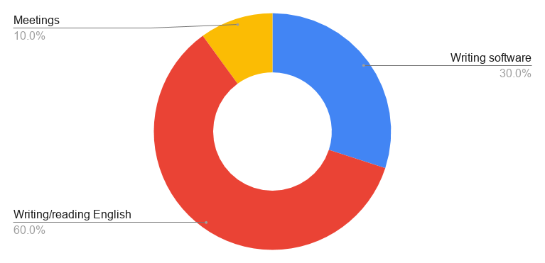 If they do well in the interview, we invite them to do a take-home challenge and we start to communicate more in writing. Bevy is a remote company and most of our communication is written, so this part is very revealing. My unscientific estimate of how much time an individual contributor spends writing software or writing and speaking English looks roughly like this: