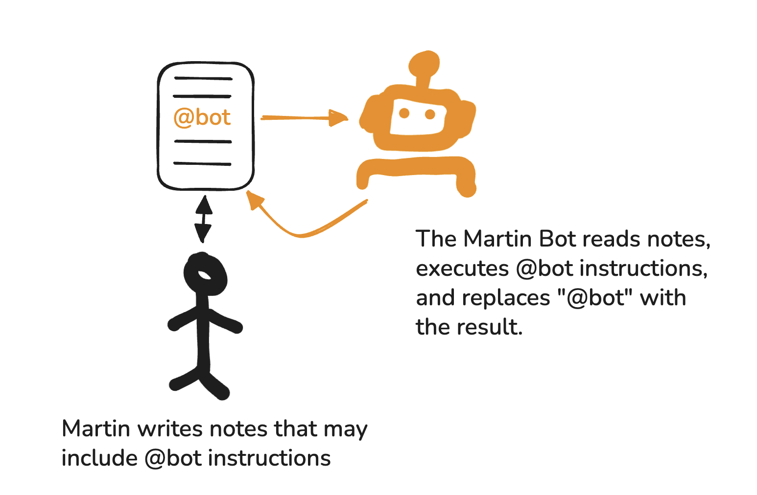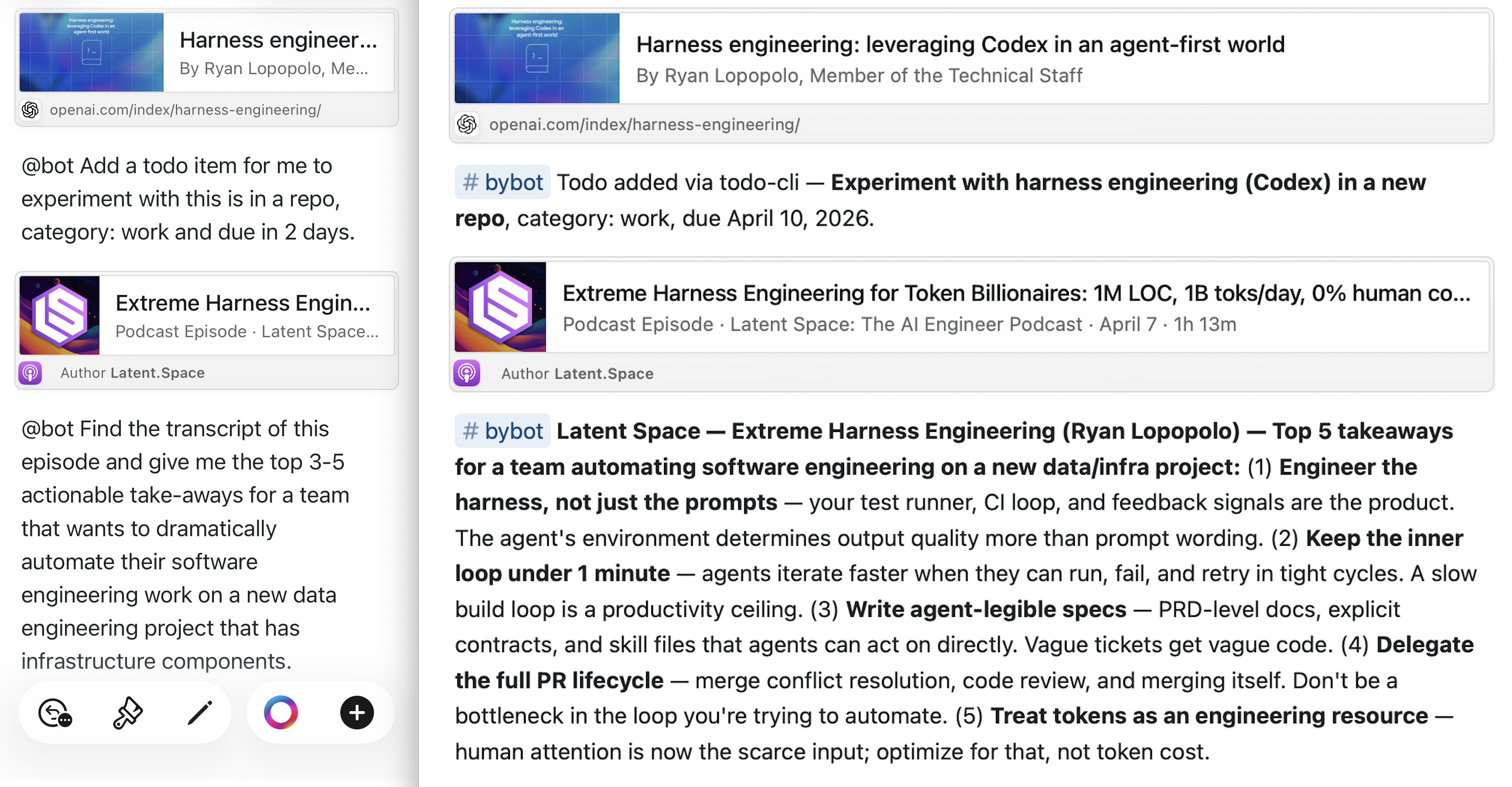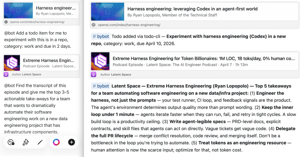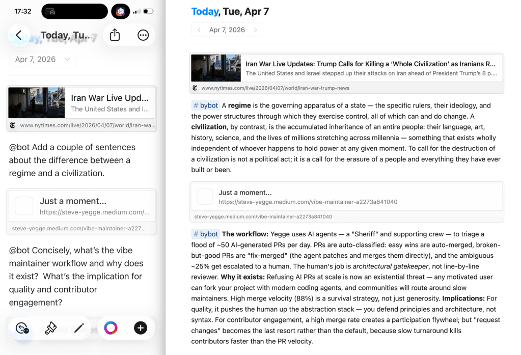 Asking the agent to prefix its results with the #bybot tag is important. It doesn’t edit my notes outside of @bot instructions. My notes are my notes. I could ask the agent to just “make all of my notes better,” but I don’t want to become The Martin Bot. The agent’s additions are clearly separated and tagged.