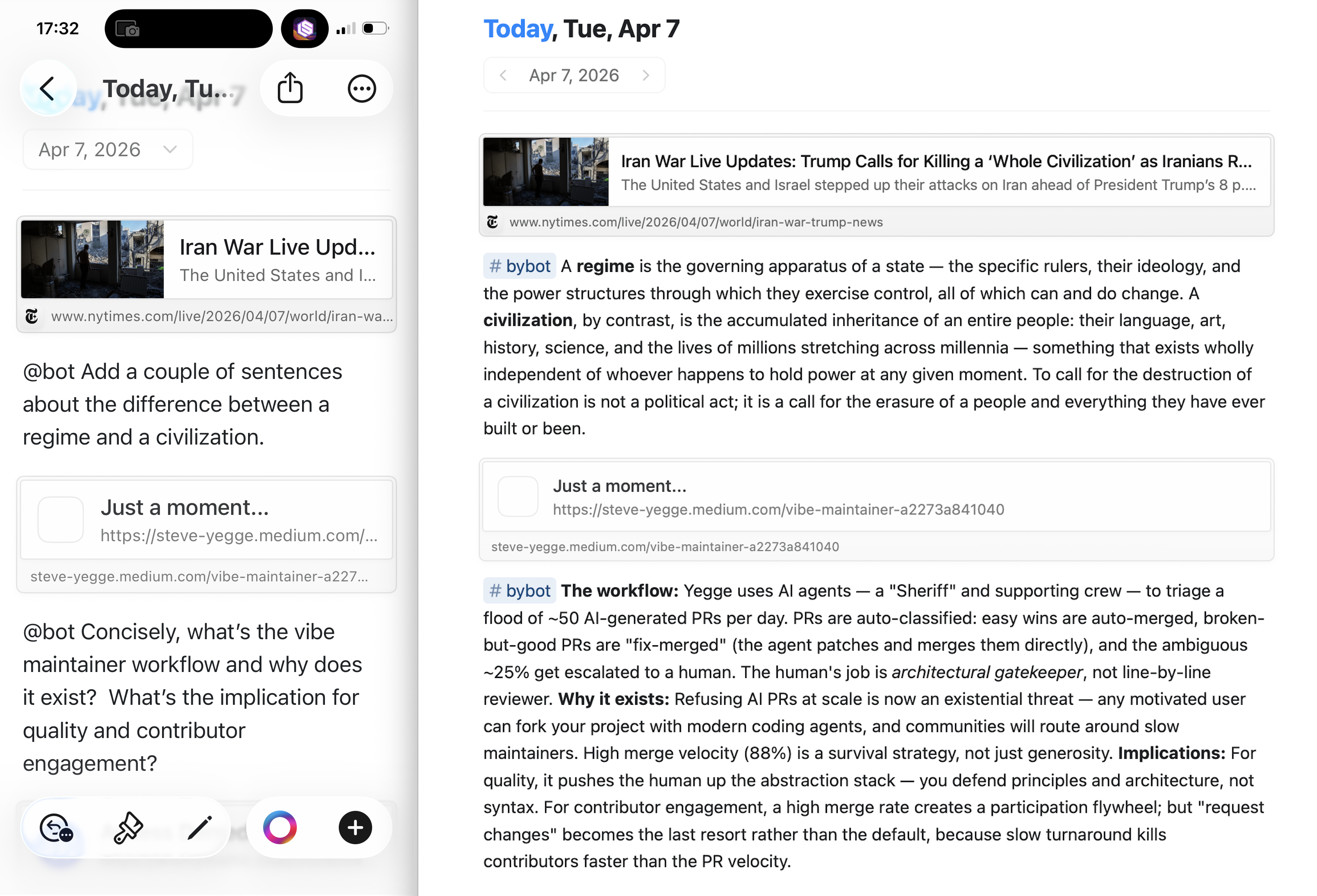 Here are some examples of The Martin Bot‘s work from the past few days. Note that when you paste a URL on its own line, Craft turns it into a “rich link,” which is what you see in the screenshots below. Links shared to Craft from another iOS app make up most of my daily notes.