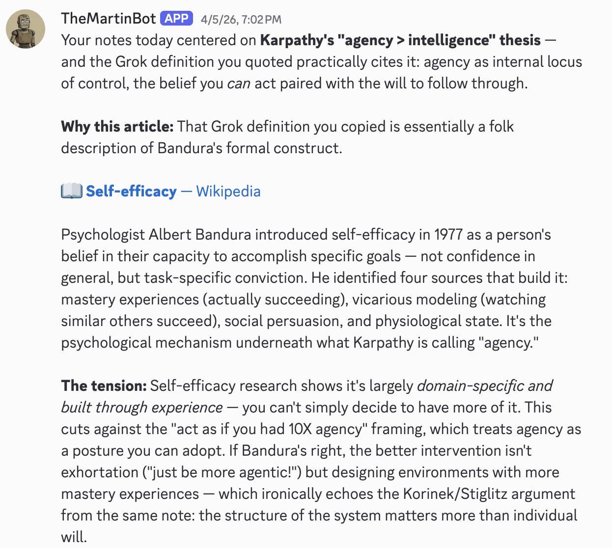 The bot contributions make my notes richer and become a permanent and searchable part of my knowledge base. Even the agent itself benefits when it sends me the daily Wikipedia article 30 minutes later at 7 PM. It selects an article that matches a theme from today’s notes.