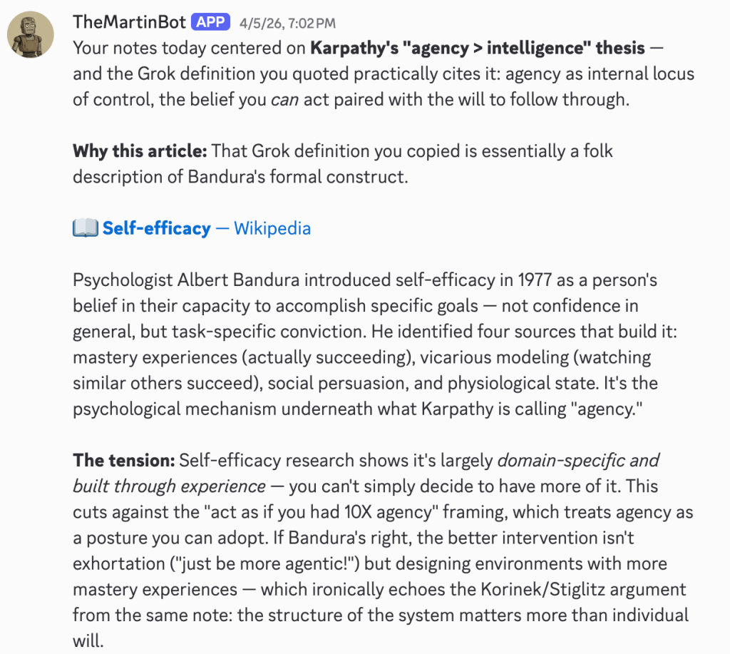 Why don’t I just prompt a model directly and paste in the answer while I’m taking notes? It’s partly the tooling. While Craft does have an assistant in the app, it doesn’t have access to my agent’s skills. And it’s mostly that I’m in a note-taking flow and don’t feel like waiting for an answer and being tempted to edit it. It fits better into my end-of-day note processing routine, so I delegate it to The Martin Bot to handle in the future.