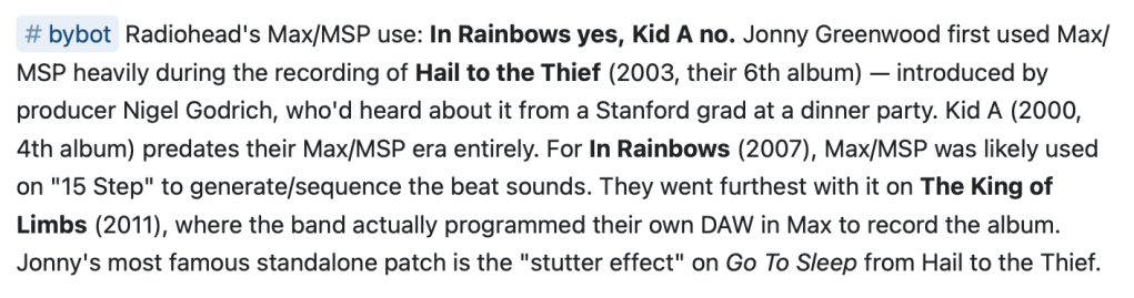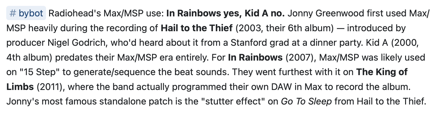 This nudge from the bot gave me an idea … why don’t you look it up, bot!? What if I could leave instructions for The Martin Bot to clean up or enrich my notes while it reviews them? Something like, “@bot Tell me whether Radiohead used Max on In Rainbows or Kid A”.